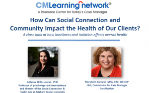 CCMC is proud to offer the following webinar, podcast, and issue brief to both professional case managers and a broader audience. By taking advantage of these resources, case managers will better understand the health consequences of loneliness and they will be empowered to prioritize interventions, leverage family and community support; and, identify ways in which they can connect those they serve to important community resources, support groups, and social services. As a network organization of the National Academy of Medicine's (NAM) Change Maker Campaign for Health Workforce Well-Being, the Commission is committed to advancing solutions that address rising rates of stress and emotional exhaustion within the health workforce.